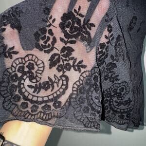 Sheer mesh top, unlined with black floral/rose gradient detail on the front.