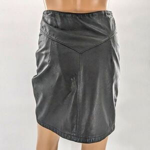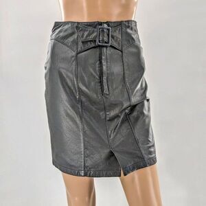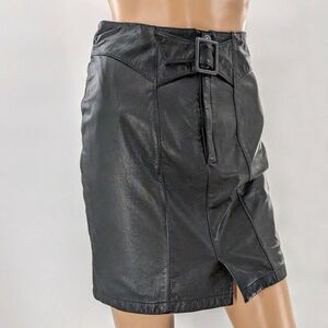 Vintage 90s Vibes Rhythm & Fashion leather mini skirt. Black. Slit up front. Zip and oversized buckle closure. Western look. High waisted. Textured leather. Lined. Skirt is in good vintage condition with light wear to leather.