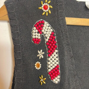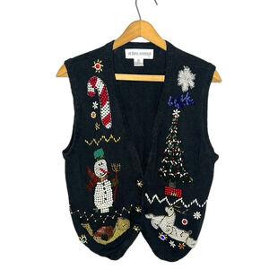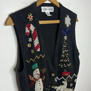Festive vintage 90s holiday sweater vest by Victoria Harbour, covered in detailed beaded and pearl embellishments. Features a snowman, candy cane, reindeer, Christmas tree, and snowflake.