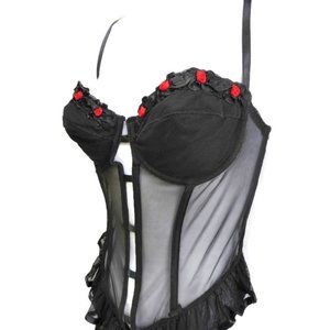 Vintage 90s Victoria's Secret Lingerie Teddy Black Body with Red & Black Rosette Trim. Underwire Bra. Bodice Boning. High Cut. Garter Belts. Adjustable Shoulder Straps. Plastic Bottom Snaps. Made in Colombia with USA Fabric. Tagged Size 34C.