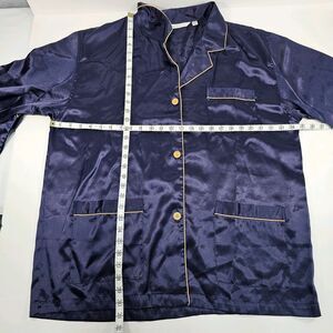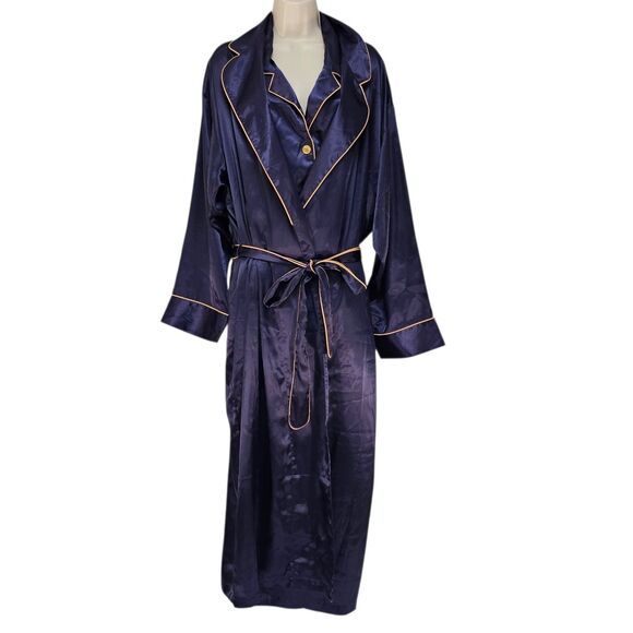Vintage 1996 Victoria's Secret Midnight Blue Satin Long Kimono Robe w/ Gold Trim & Matching Pajama Shirt Set Size XL