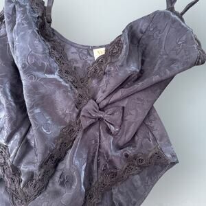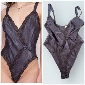 Vintage 90s Victoria's Secret lingerie bodysuit in charcoal grey jacquard satin with lace trim, high cut hips, and three snaps for closure in the gusset. The front wraps across the waist and closes with a snap underneath a decorative bow.