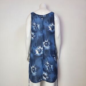 Vintage 90s Villoria Virini blue and white floral semi-sheer sleeveless mini dress with round neck and 2 non-detachable ties in back.