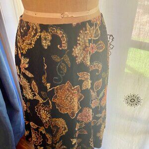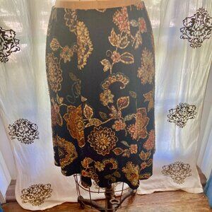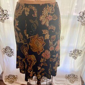 An elastic waist flippy gored floral skirt by West End Petites. Print is done in earthy tones on black.