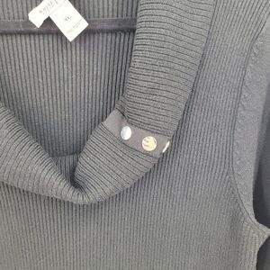 Edgy 90's vintage White House Black Market ribbed knit sweater dress in black. The dress features a unique cowl neck and long sleeves, perfect for a stylish and cozy outfit.