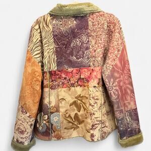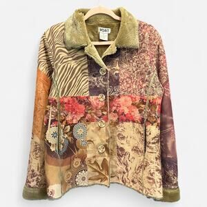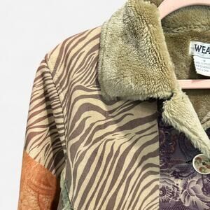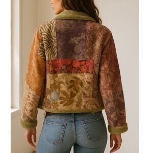Vintage 90s Weavz Boho Chic Floral Patchwork Faux Suede Faux Shearling Coat