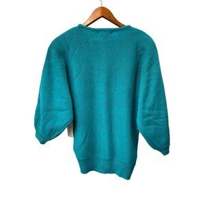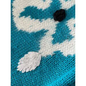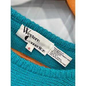 Vintage Western Connection teal sweater featuring floral embroidery with black and white accents. Crafted with an acrylic and angora blend; puff sleeves and ribbed hem design.