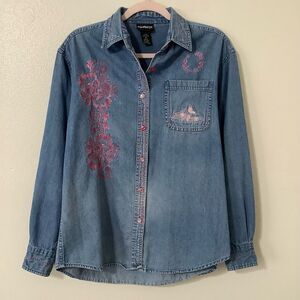 Vintage 90s Western Cottagecore Grandmacore Pink Embroidered Denim Blouse Medium