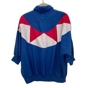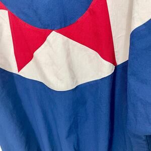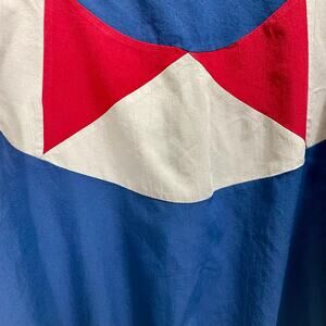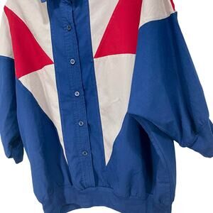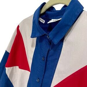 Step back in time with this vibrant vintage 90s Cortiva button-up top! Featuring a bold geometric pattern in red, white, and blue, this batwing top is sure to turn heads.