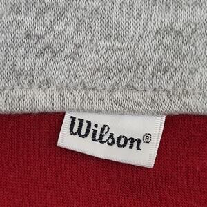 Vintage 90s Wilson hooded fleece vest in bold black, gray, and red colorblock design. Women's Large (22x23), sporty retro tennis style with zip-up front and sleeveless cut.