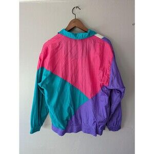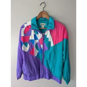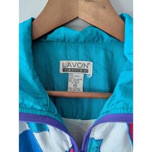 Vintage 90s geometric color block design windbreaker. The jacket is by Lavon Petites and has a geometric sort of post modern design with bright hues of white, purple, blue, green, and pink.