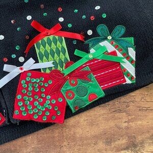Embroidered, beaded and sequined applique Christmas ornaments, presents and bows