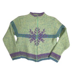 • Nordic star design • Zipper front closure • Ribbed cuffs and hem • Pastel green and purple color • Made in USA - This cardi / jacket is so cute and cozy! The colors are so beautiful and the design is flattering on everyone. In excellent condition.