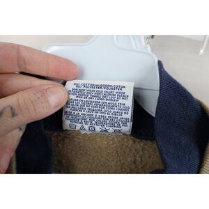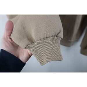 Bleach blemishes front/back. Dark spots front, stains arms/cuffs. Inner collar discolored. Design distressed. Color faded. Pilling. Made in USA