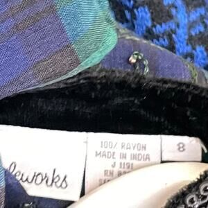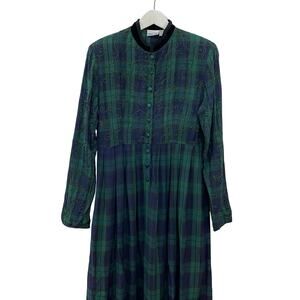 Vintage 90s Women's Sz 8 Green Blue Plaid Embroidered Beaded Winter Maxi Dress