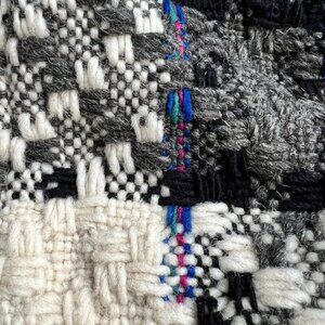 This chunky boxy-shaped wool sweater features a crew neck, dropped shoulders, and long sleeves. The neckline, cuff, and hem are a cream-colored rib knit with a gray stripe. The body of the sweater is cream with a large black and dark gray plaid with pink blue and green. Excellent condition, no holes or stains. Made in Ecuador. Size XL based on measurements.