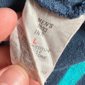 Step into timeless style with this vintage Woolrich navy and teal striped polo shirt.