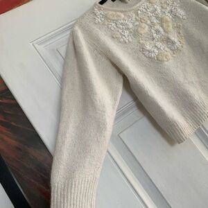 Vintage work in progress white floral sweater size large. Preowned good condition! 55% silk 33% nylon 10% angora (rabbit hair) 2% lambs wool. 21 in pit to pit, 19 in top to bottom: ships in 1-2 days 🍫