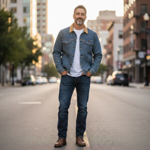Color: Classic mid-blue denim, tan corduroy collar.