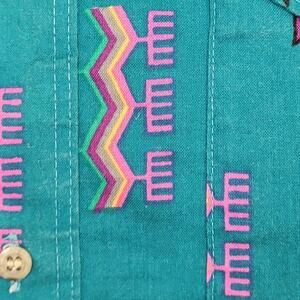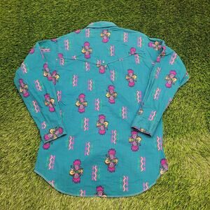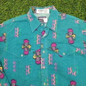 Vintage 90s Wrangler Western Button Shirt Mens Large 16-34 Aztec Cowboy Cut Tribal Aztec Southwestern Print Teal X-Long Tails Single-Needle Tailoring Pointed Flap Pockets Rodeo Ranchwear Made In USA Brushpooper Style