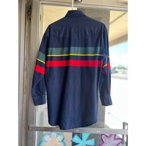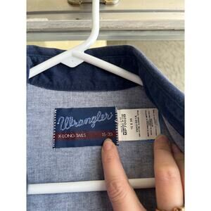 Vintage 1990’s blue Wrangler striped button down western shirt. There are no major stains, holes, or tears. The tag says size 15-33. It fits a size medium. Please check measurements before purchasing!