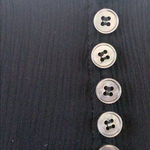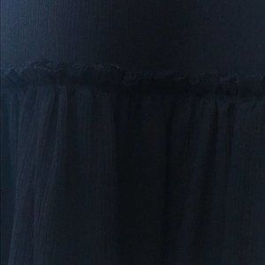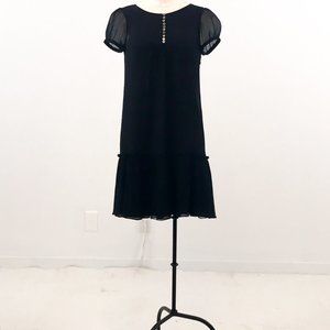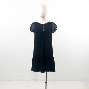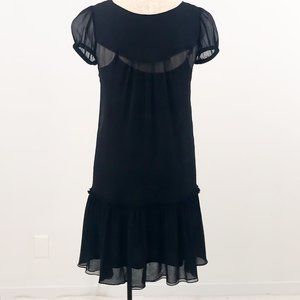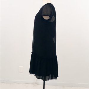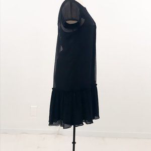 Generra Italian Silk Black Mini Dress w ruffle hem & sheer puffy statement sleeves. Chiffon overdress w buttons. Stretchy slip underneath. Seasonless & lightweight. Wednesday Addams, 90s grunge vibes.