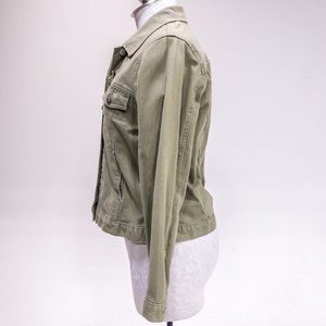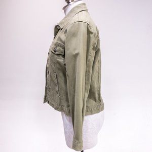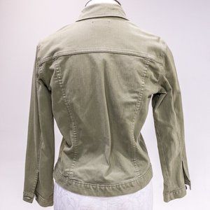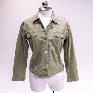 Vintage 90s Y2K jean jacket from Anthropologie -- stretchycotton in a neutral soft moss green jean tan grey neutral color. If you got your personal color analysis and are an Autumn or Summer or have olive skin, you may know that this softer green is more flattering than dark blue. Hard to find shade! Closet staple w classic collar & functional chest pockets. Short length, long sleeves, & relaxed fit. Year round must have and perfect transitional layering piece for fall and spring! EUC.