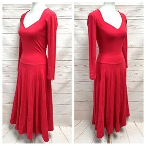 Very Rare Vintage 90’s Y2K Betsey Johnson x Lew Magram Collection New York Red Long Sleeve Maxi Gown Dress. 90’s large font label. Sweetheart neckline with a drop waist, long sleeves and full skater flare maxi skirt. Stretch cotton spandex blend in a muted cherry red color. Would be so cute paired with done Doc Martens.