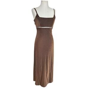 Stunning vintage 90s/Y2K Betsy & Adam maxi length sheath prom dress in a size 3/4. The color is a gorgeous bronze. The fabric has metallic shimmery flecks throughout. It features an empire waist accented by jewels with a sheer cutout behind. This dress is in perfect preowned condition with no issues or signs of wear. Size 3/4, modeled on a size 6 mannequin.