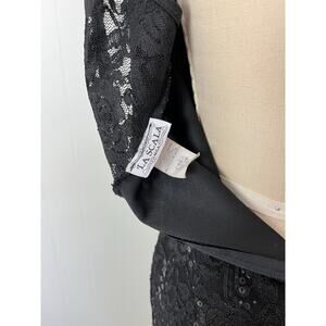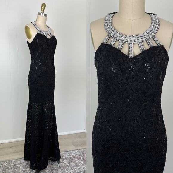 Vintage 90s Y2K Black Lace Maxi Dress Gown Medium Beaded Rhinestone Mermaid Hem