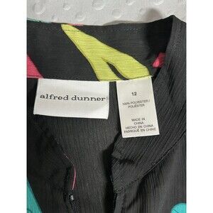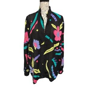This vintage 90s Y2K black sheer zip-up blouse jacket features a neon pink and blue floral pattern. The mandarin collar and satin frog closures add a touch of elegance, while the side slits and unlined material make it a lightweight and comfortable choice for any season. Perfect for travel, parties, or casual occasions, this fashion jacket from Alfred Dunner is a must-have for any stylish wardrobe.