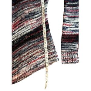 Vintage Bongo knit sweater with V-neck and diamond V-hem. Color pattern is shades of reds, blues, white, grey, and purple. Size Large, Juniors.