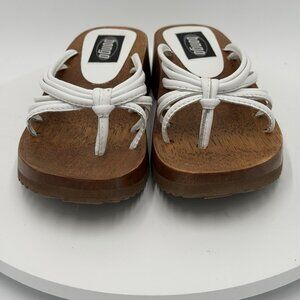 Vintage 90s Y2K Bongo Wood Platform Wedge Heels White Leather Thong Sandals Sz 6