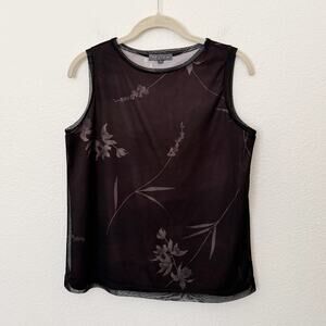 [Vintage] 90s Y2K Brown Black Mesh Crew Neck Floral Print Tank Top Size Small S
