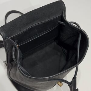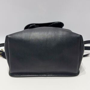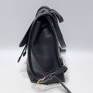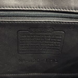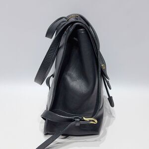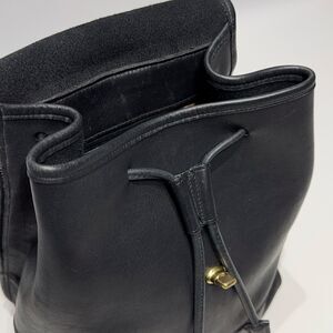 This vintage 90s Coach backpack, model number 9791, features a classic black leather exterior with a turn lock closure and gold hardware. The bag has a rectangular shape with dimensions of 9 inches in width, 11 inches in height, and 6 inches in depth, making it spacious for day-to-day use. The black leather handle/straps complement the exterior, while the interior is lined in black as well. This stylish and timeless piece embodies the 90s fashion trend and is a must-have for any vintage enthusiast.