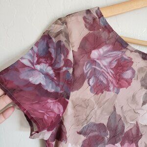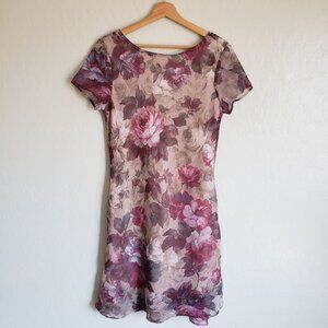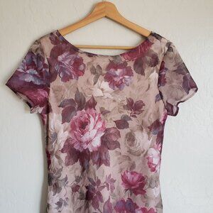 Vintage 90's Y2K Romantic Whimsigoth Fairy Connected Apparel Floral Flowy Midi Dress Size Women's 10 Short Sleeve Tan/Red/Cream