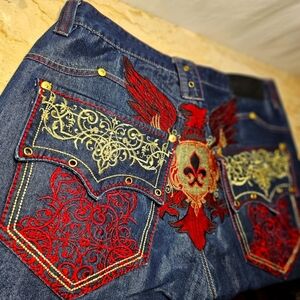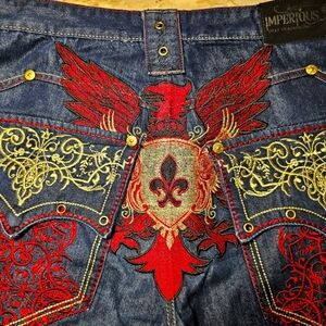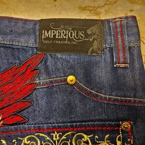 Vintage 90's Y2K | Delf Trading, Inc. IMPERIOUS | Mens Straight Leg Dark Wash baggy style Blue denim Jeans with light sheen | to-die-for red & gold metallic embroidery/stitching and appliqued eagle emblem | 5-pocket jeans - back pockets & small pocket watch pocket have snap closures | 100% cotton | Size 36 X 32 - 12.5" rise | Excellent/like new pre-owned condition