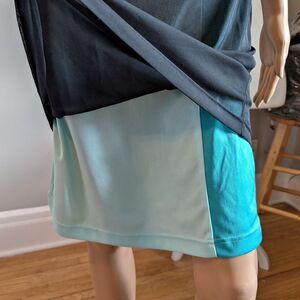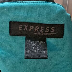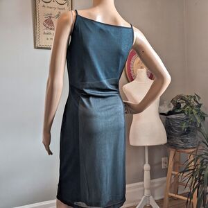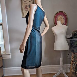 Vintage late 1990s, early 2000s (Y2K) Express mini dress. Semi-sheer mesh black overlay with blue/teal lining. The lining is semi-visible, but the colors are muted due to the black overlay. Sleeveless. High square neck/boatneck. Dress is in good vintage condition with light wear and no flaws.