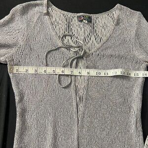 Preowned, GUC. This is a rare vintage piece, that is in good condition given its age. Cute silver metallic crochet, with single tie front. Sheer and very feminine, fringe along the bottom hemline. These were used as gogo dancer costumes, only worn a few times, then cleaned and stored for over 20 years. A great addition to that holiday wardrobe.