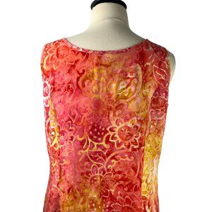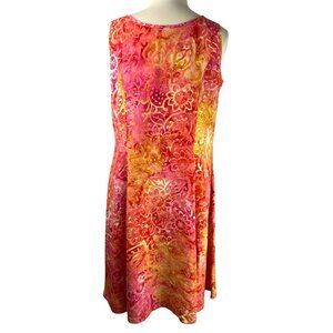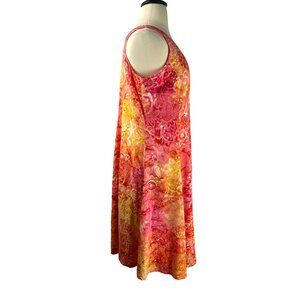 This Vintage 90's Y2K Norm Thompson tie dye dress is a gem. A maxi length button front design in a vibrant blend of orange, red, yellow, and pink. Women's size PXL, crafted from 100% cotton with shell buttons. Perfect for festival wear or a unique casual look.