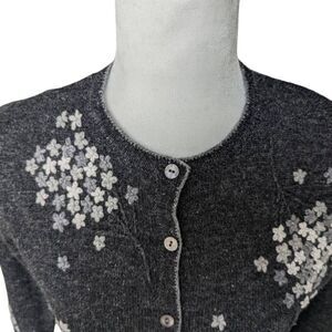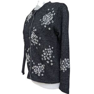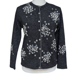 Vintage 90s Y2K Gray Knit Cardigan Sweater White Embroidered Flower Small P Wool