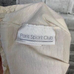 Add a touch of vintage charm to your wardrobe with this beautiful ivory camisole crop tank top from Paris Sport Club. The square neckline and wide sheer lace straps provide a comfortable fit for this lightweight and sheer lace top, which features a lovely floral pattern and embroidered accents. Perfect for any occasion, whether it be for travel, weddings, parties, or casual wear, this top is made of a blend of polyester and cotton and is easy to care for with its machine washable fabric. This Y2K-inspired top is perfect for those who love the hipster, bohemian, and retro styles. The strappy sleeve design and pullover closure make it easy to wear, while the preppy and princess themes add a touch of playfulness to the outfit. This top is available in size L and is a regular fit. Don't miss out on this beautiful piece that is sure to turn heads.