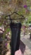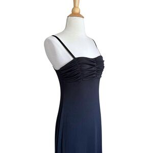 This vintage La Belle Made in USA is of the late 1990s to early Y2K era. It’s made from lightweight black polyester and features a ruched sweetheart bust, slim adjustable spaghetti straps, empire waist, and a body-skimming silhouette that flows into an asymmetrical hemline for added drama.