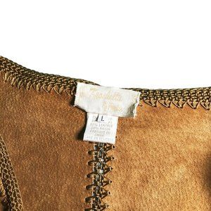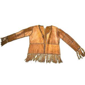 Essential jacket for a 90s/Y2K look. Features fringe tassels along the sleeve cuffs and bottom of the coat, embroidery or knitting throughout to connect the pieces of leather together, light brown suede leather material, and button closure.