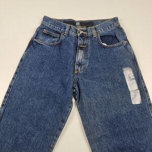 These jeans come with a zip and button closure, and have a waist size of 28 inches with an inseam of 32 inches. The blue color and mid-rise cut add to their classic appeal. Perfect for anyone looking to add a touch of nostalgia to their wardrobe, these Marithe Francois Girbaud Complements jeans are a must-have.