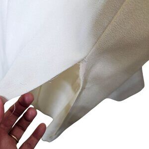 Minor hem issue on the slit. Its a bit unraveled. The hook and eye clip is missing the eye.