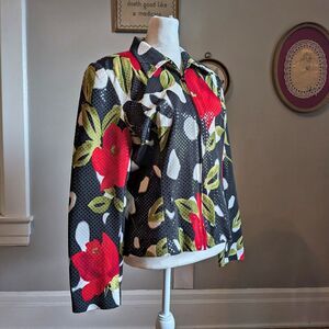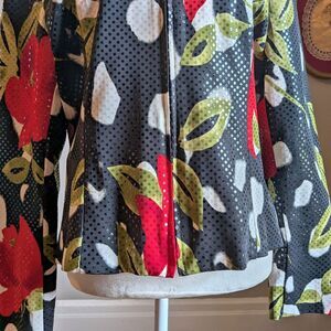 Vintage late 1990s, early 2000s (Y2K) Mesmerize sequin floral jacket. Black with red rose print. Long sleeves. Built in shoulder pads. Zip front. Collared. Lined. Jacket is in good condition with possible missing sequins.