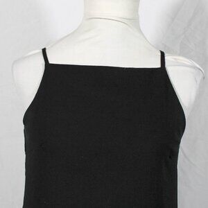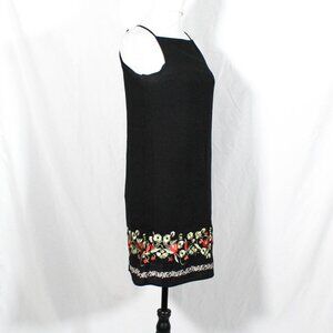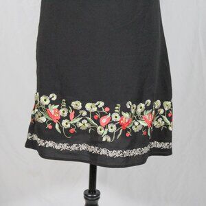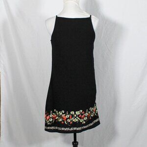 Vintage late 90s / Y2K mini dress by Bisou Bisou โ size 2. Black with floral embroidered hem in green, white & coral red. Square neckline, spaghetti straps, lined. Gives 60s rocker / Daisy Jones / Penny Lane vibes.