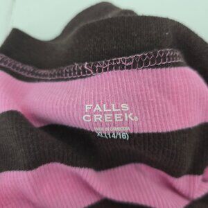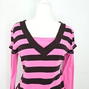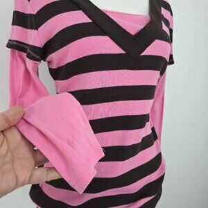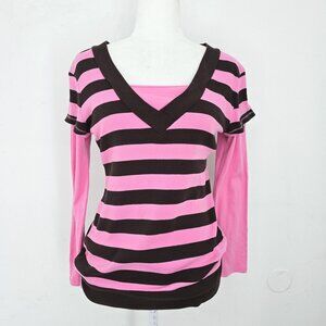 Vintage 90s Y2K Pink Brown VNeck Overlay Ribbed Long Sleeve Top KIds 14/16 Women Small /Medium