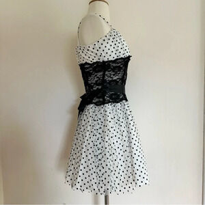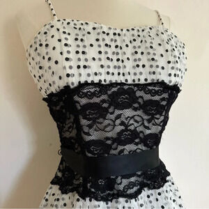 Vintage 90s Y2K homecoming dress white and black polka dot tulle overlay, with spaghetti straps, gathered milkmaid bust, black lace overlay on bodice, flouncy skirt, satin tie at waist, back zipper closure.